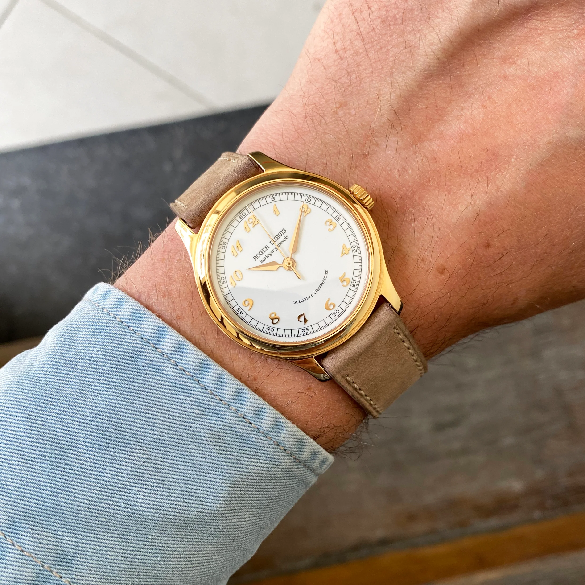 The dial is white enamel with gold polished Breguet numerals. An outer black printed minute and second tracker contrasts well against the white texture along with the gold arrow-head hands.